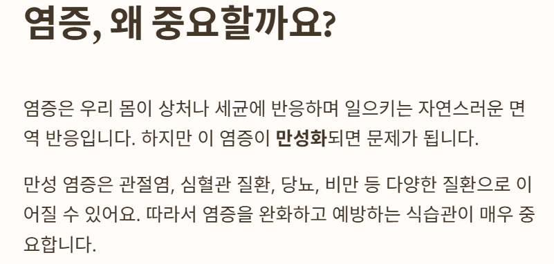 염증은 우리 몸이 상처나 세균, 자극에 반응하며 일으키는 자연스러운 면역 반응입니다. 하지만 이 염증이 만성화되면 관절염, 심혈관 질환, 당뇨, 비만 등 다양한 질환으로 이어질 수 있습니다. 따라서 염증을 완화하고 예방하는 식습관이 매우 중요합니다.